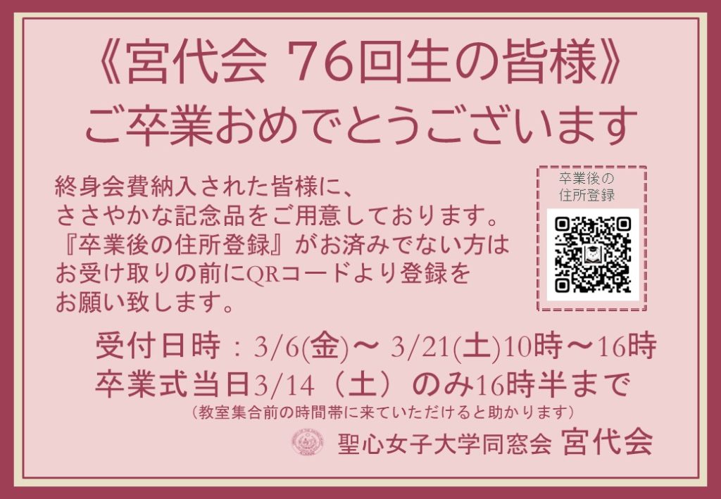 2026年3月5日 2026年3月ご卒業の皆様へ 記念品のお受け取り 宮代会の一員として歩み始める皆様に、宮代会入会の記念品を準備しております。宮代会館でお受け取りください。3月21日(土)まで。 卒業後の住所登録 卒業後の住所登録をお願いいたします(グーグルフォーム)。 住所登録はこちら 終身会費 お手続きはこちらからをお願いいたします(クレジットカード決済)。お振込みをご希望の場合は、宮代会事務室にご連絡ください。 終身会費納入手続きはこちら
